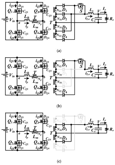 The proposed circuit with wide voltage operation is shown in Figure 1a. The basic structure of the studied circuit is a full-bridge circuit, Q1~Q4, Llk, and T, on input side and a center-tapped rectifier with two sets of secondary windings Ns1 and Ns2 and an auxiliary switch S on output side.