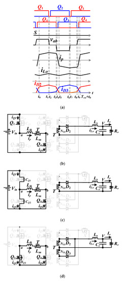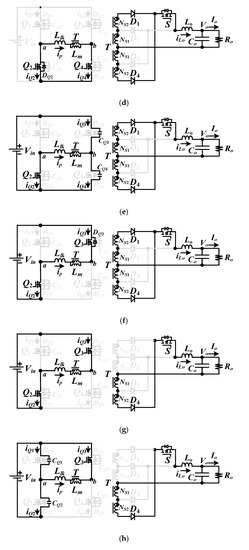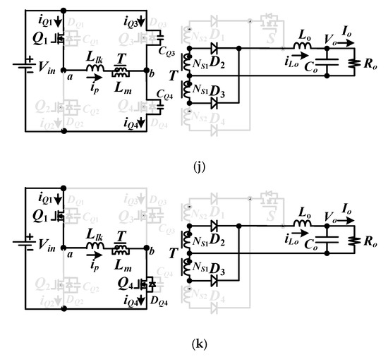 When Vin,min < Vin < 3Vin,min, auxiliary switch S is turned on. The effective duty cycle deff of full-bridge circuit is related to input voltage. The transformer turn-ratio in low voltage range is nL = Np/(Ns1 + Ns2). The dc voltage gain is expressed as GL = Vo/Vin.L = 2deff/nL where Vin,L denotes Vin in low input voltage range. The pulse-width modulation waveforms are given in Figure 2a and the ten equivalent circuits for low voltage range operation are provided in Figure 2b–k.
