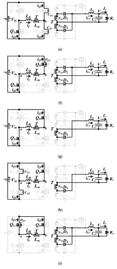 When 2Vin,min < Vin ≤ 6Vin,min, S is off and D1 and D4 are reverse biased as shown in Figure 1c. Only the secondary turns Ns1 are connected to output load and the turn-ratio of transformer in high voltage range is nH = Np/Ns1. The effective duty cycle deff depends on Vin and Io. The dc voltage gain in high voltage range operation is given as GH = Vo/Vin,H = 2deff/nH where Vin,H denotes Vin in high input voltage range. Since turn-ratio nH = 2nL due to Ns1 = Ns2, it can obtain GH = GL/2 under the same effective duty cycle deff. That means the proposed converter has high voltage gain in low input voltage range and low voltage gain in high input voltage range. The circuit waveforms in high voltage range operation are provided in Figure 3a and the ten equivalent circuits for high voltage range operation are illustrated in Figure 3b–k. The circuit operation in Figure 3b–k with the secondary winding turns Ns1 in high voltage range are similar to the circuit operations in low voltage range presented in previous section. Therefore, the circuit analysis of the presented circuit operated at high voltage range are ignored in this section.