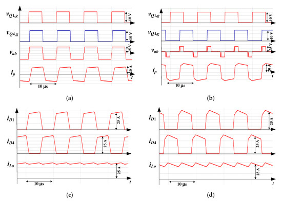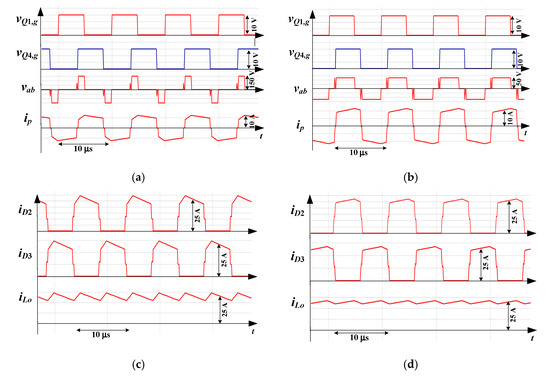 where d is duty cycle of leg voltage vab and d = deff − dloss,5. The average value of output inductor current iLo equals Io. The voltage ratings of active switches Q1–Q4 equal Vin,max. The voltage ratings of D1–D4 and S are functions of Vin,max, nL and nH.