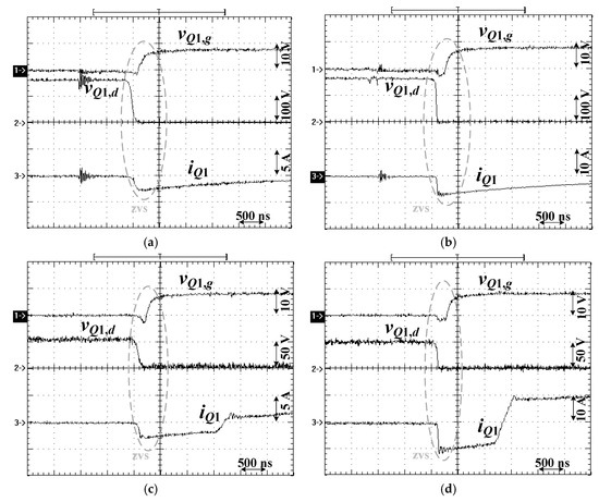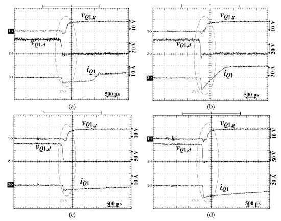 Experimental waveforms of the leading-leg switch Q1 in high input voltage range at (a) 150 V input and 20% load (b) 150 V input and 100% load (c) 50 V input and 20% load (d) 50 V input and 100% load.