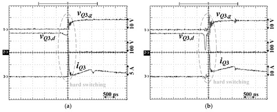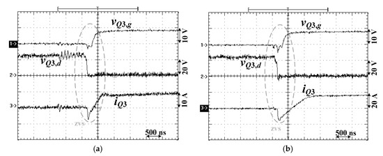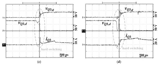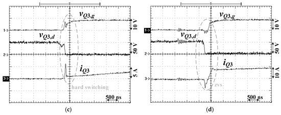 Experimental waveforms of the lagging-leg switch Q3 in high input voltage range at (a) 150 V input and 20% load (b) 150 V input and 100% load (c) 50 V input and 20% load (d) 50 V input and 100% load.