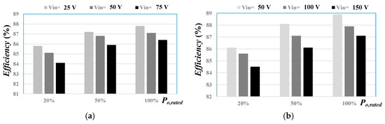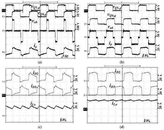 Figure 4a shows the control block of the signals Q1~Q4 and S. Schmitt trigger comparator is adopted to generate the signal S in order to select the correct range of input voltage. The PWM signals are generated by phase-shift PWM integrated circuit UCC3895. The output voltage is controlled by the voltage regulator TL431 and PC817. Figure 4b provides the photograph of the prototype. Figure 5 demonstrates the simulated results of the primary-side and the secondary-side voltages and currents at full load under low input voltage range for both Vin = 25 V and 75 V. One can observe that the effective duty cycle of vab at Vin = 25 V is larger than the duty cycle at Vin = 75 V. Therefore, the current ripple ΔiLo at Vin = 25 V is less than current ripple ΔiLo at Vin = 75 V. Similarly, the simulated results of the presented circuit operated at high input voltage range are provided in Figure 6 for both Vin = 150 V and 50 V. The lower input voltage (Vin = 50 V) has the larger duty cycle to reduce the output ripple current ΔiLo compared to the condition at Vin = 150 V case. Experiments from a prototype with circuit components derived from previous section are provides to demonstrate the converter performance. The proposed circuit is operated at low input voltage range when Vin is increased from 25 V to 75 V. Then, the circuit goes to the high input voltage mode. If the input voltage is decreased from 150 V to 50 V, then the circuit operation goes to low input voltage range. Based on the input voltage operation range. Figure 7, Figure 8 and Figure 9 gives the test results when input voltage is in low voltage range. Under low input voltage range, auxiliary switch S is on. Thus, the rectifier diodes D2 and D3 are reverse biased and off. Figure 7a,b show the experimental waveforms of the gate voltages, leg voltage vab and the primary current ip at Vin = 25 V and 75 V and the rated output. It is clear that the converter has less phase-shift between Q1 and Q4 and larger duty cycle on leg voltage vab at Vin = 25 V input. Figure 7c,d provides the test waveforms of iD1, iD4 and iLo at Vin = 25 V and 75 V and the rated power. Due the converter at Vin = 25 V input has large duty cycle, iLo has less current ripple at Vin = 25 V input compared to Vin = 75 V input. Figure 8a,b provides the experimental waveforms of switch Q1 in leading-leg at 20% and 100% loads under Vin = 25 V input. It is clear the soft switching operation of Q1 is achieved from 20% load under 25 V input case. In the same manner, test waveforms of Q1 at 20% and 100% loads under 75 V input are given in Figure 8c,d. It can observe that Q1 is also turned on at zero-voltage switching from 20% load at Vin =75 V input case. Switches Q1 and Q2 have the same turn-on/off characteristics in the leading-leg. Therefore, the soft switching operation of switches Q1 and Q2 at leading-leg can be accomplished from 20% load in low input voltage range operation. Figure 9a,b show the test waveforms of the switch Q3 at lagging-leg for 20% and 100% loads under 25 V input. It is clear that Q3 is also turned on at zero voltage switching from 20% load. Figure 9c,d provide the measured waveforms of Q3 at 75 V input. It can observe that Q3 is hard switching at 75 V input case for both 20% and 100% loads. The soft switching condition of power switches at lagging-leg (leading-leg) is related to the leakage inductor (output inductor). Normally, the leakage inductance is much less than the output inductance. Therefore, power switches at leading-leg have wide zero-voltage switching range compared to the lagging-leg switches. The test results shown in Figure 8 and Figure 9 agree with these statements. Figure 10, Figure 11 and Figure 12 gives the experimental waveforms of the proposed converter for high input voltage range operation at 150 V and 50 V input. The test waveforms of vQ1,g, vQ4,g, vab and ip at Vin = 150 V and 50 V under rated power are provided in Figure 10a,b. Compared to 150 V input case, the proposed converter has less phase-shift between Q1 and Q4 and larger duty cycle on leg voltage vab at Vin = 50 V input. The test results of iD1, iD4 and iLo at 100% load under 150 V and 50 V input are shown in Figure 10c,d. Figure 11 provides the experimental waveforms of leading-leg switch Q1 at various load power and input voltage values in high voltage range operation. It is clear that the soft switching operation of Q1 is accomplished from 20% load for both 150 V and 50 V input. Similarly, the test waveforms of lagging-leg switch Q3 at various load power and input voltage values are demonstrated in Figure 12. It can be observed that Q3 has soft switching operation only at 50 V input under 100% load and hard switching operation for the other conditions. Figure 13 provides the test results of the circuit efficiencies. For both low and high voltage range operation, the lower input voltage has larger effective duty cycle and less conduction losses on power switches compared to the higher input voltage. Thus, the circuit efficiency at 25 V input is better than 75 V input in low input voltage range. Similarly, the circuit efficiency at 50 V is better than 150 V input in high voltage range operation.
