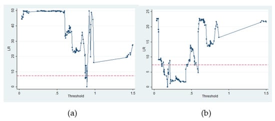 To better observe the estimation and confidence interval of the threshold value, the threshold value of the least squares is used to identify the threshold value. The threshold estimate is the value of when is zero. Next, the likelihood ratio function graphs of the two threshold values are plotted, as shown in Figure 1.
