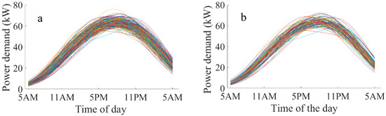 Figure 2. Load profiles of charging station during different days: (a) working day; (b) holiday.