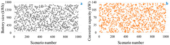 The input data for this section comprises of 1000 random samples of battery size and converter size, generated using Monte Carlo simulations. However, any finite number of scenarios can be generated and any finite number of EVs can be considered. The maximum number of scenarios/EVs is constrained by the computational/storage capability of the machine solving the problem. The range for battery size has been taken as between one and two times of the determined value (1662) and the generated samples are shown in Figure 4a. Similarly, the range for samples of converter size is also set between one and two times of the determined value (136) and the generated samples are shown in Figure 4b. Each sample pair (battery size and converter size) has been fed to the operation algorithm at a time and the results (total cost, investment cost, and peak power buying) has been stored. The results of all the samples are compared with the determined sizes of battery and converter in [16], which will be discussed in the following sections.