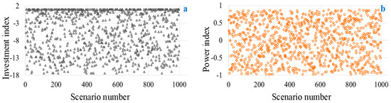 Similar to the cost index, an additional index named as a power index is proposed to evaluate the performance of the generated scenarios and the determined size in terms of power bought during peak price intervals and the corresponding investment cost of the ESS. The ratio of power ( P s R a t ) and investment cost ( I s R a t ) are determined using Equations (4) and (5), respectively. Where, P O p t and I O p t , respectively represent the amount of power bought and corresponding investment cost of the ESS for the optimal case (to be verified). Similarly, P s and I s , respectively represent the power bought and the investment cost of the ESS for scenario s. Negative values of P s R a t imply that scenario s is performing better than the determined size in terms of power buying and vice versa. Same is the case for I s R a t with respect to the investment cost. It is worth noting that a particular scenario could perform better in one of the two aspects but should not perform better in both aspects simultaneously. Otherwise, the determined size of the ESS will be declared as sub-optimal. Therefore, Equation (6) is utilized to determine the performance of scenario s in comparison with the determined sizes, considering both power and investment cost. Finally, Equation (7) can be utilized to determine the normalized PI index, where positive values imply that the determined size is sub-optimal. PI needs to be zero to show that none of the scenarios was performing better than the determined size.