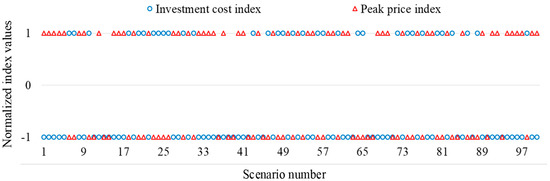 Figure 6. Normalized values of investment cost and price indices for the first 100 scenarios.