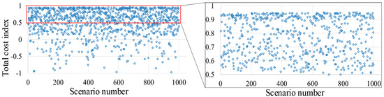 The second index proposed in this study for evaluating the optimality of determined battery and converter sizes in a fast-charging EV station is the cost index. The cost index utilizes the information of the total yearly cost for each scenario and compares it with the cost for determined sizes of battery and the converter (optimal case). The values of cost for the generated scenarios, using Equation (2), are shown in Figure 7. In Figure 7, values less than one indicate that the determined sizes are performing better than that particular scenario. Similarly, the value of one indicates that the particular scenario is performing the same with that of the determined sizes. Finally, greater than one values indicate that the particular scenario is performing better than the determined sizes. It can be observed from Figure 7 that, in all the scenarios, the values of the cost index are less than one. For the sake of visualization, the values between 0.5 and 1 are zoomed out on the right side of Figure 7. It can be clearly seen from the right side of the figure that none of the scenarios have values equal to or greater than one. Since both price index (computed in the previous section) and the cost index for the determined sizes are performing better as compared to all the scenarios. It implies that the proposed sizes of battery and converter in [16] are optimal.