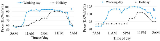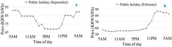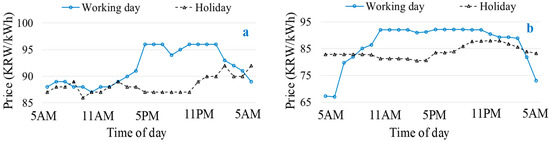 Figure 10. Hourly market price signals for different public holidays: (a) Chuseok; (b) Seollal.