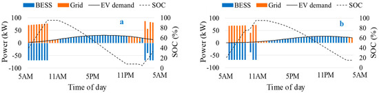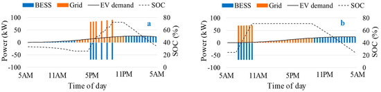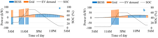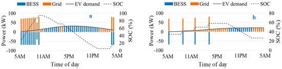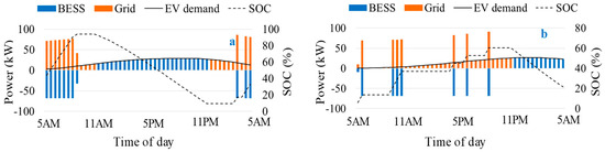 January 14 and 15 are taken as the representative days for the winter season in this section, where January 14 is a holiday (Sunday) and January 15 is working day (Monday). The market prices shown in Figure 8a are used as input for this case. It can be observed from Figure 11a that during off-peak price intervals (5–8 a.m.), power is bought from the grid and the battery is charged and also the demand of EVs is fulfilled by buying power from the grid. During peak price intervals (11 a.m. to 11 p.m.), the battery is discharged to fulfill the load demand of the charging station. In the last intervals, the battery is charged again to save energy for the following day. In the case of the holiday, the ESS is charged during different hours of the day and is only discharged during the peak hours, 11 p.m. onwards. It is interesting to note that during the holiday, the ESS is not fully charged due to the smaller number of peak load intervals during the holidays. It implies that the size of the battery is sufficient for this particular case since the optimization algorithm has determined the size by considering different days of the year. In the winter season, none of the power was bought from the grid during peak intervals.