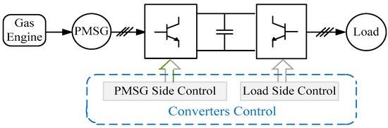 When the active rectifier is adopted in the gas engine generator system, the generator side converter and the load or grid side converter can be separately controlled to achieve a desirable performance and reliability of the system. The generator side converter control algorithm depends on the type of used generator in the system. The permanent magnet synchronous generator (PMSG) has been increasingly used in wind power systems owing to its higher efficiency, no excitation losses, less weight and smaller size in comparison of other types of generators [8,9]. The modelling and design of PMSG are analyzed in References [10,11,12]. The performance of PMSG in wind power systems is also investigated by applying various control approaches to the generator side converter [13,14,15,16,17,18,19,20]. A variable-speed PMSG system with a diode rectifier that is connected to a dc chopper is studied in References [13,14]. Despite a simple and low-cost solution, this system outputs high harmonic distortion current which affects the generator efficiency. In Reference [15], the dynamic performance of a grid-connected PMSG wind energy system is investigated with a fully controllable frequency converter. The generator side converter is controlled to reduce the stator flux and minimize core losses by imposing the reactive current on the d-axis component. In Reference [16], the zero d-axis control (ZDC) approach is adopted for the control of PMSG to minimize power losses and maximize available torque. Also in References [17,18], the ZDC control is developed for the control of the PMSG side converter. In Reference [19], the unity power factor (UPF) control approach is adopted for the PMSG side converter. This control approach can also help the system to minimize power losses and maximize the available torque. In Reference [20], a constant stator voltage (CSV) control strategy is proposed for the control of the PMSG side converter. In Reference [21], the controlled PMSG by the UPF method is applied to an internal combustion engine generator system. From References [13,14,15,16,17,18,19,20,21], different control methods are used for the control of PMSG side converter in order to achieve the diverse targeted control purpose of each system. For the load or grid side converter control, the conventional vector control method is employed to control the voltage and power.