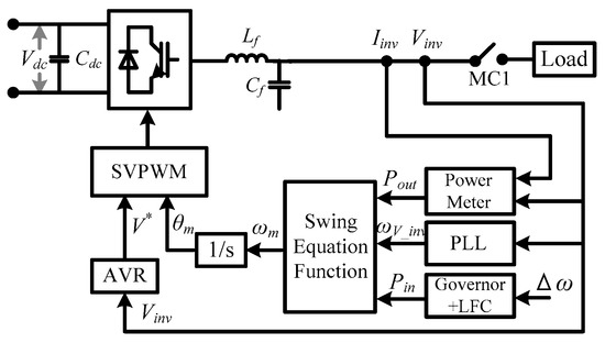 The VSG control was used for the control of load side converters. The VSG control scheme proposed in this study is shown in Figure 2. In this figure, the “Swing Equation Function” block emulates the function of the well-known swing equation of an SG as expressed in Equation (1).