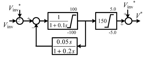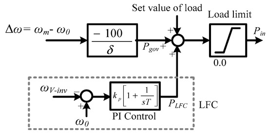 Like a typical SG, the automatic voltage regulator (AVR) was used to regulate the actual inverter voltage Vinv to match the inverter base voltage Vinv*. The output of AVR was the voltage magnitude reference V* for inverter output voltage. The block diagram of AVR is shown in Figure 3. A governor function could also be performed in the VSG control scheme for the control of the load-power as shown in Figure 4. In this study, the time delay of the governor function was omitted and δ was the droop coefficient in percent. However, if load variations occur, the frequency deviates from the base frequency due to the droop characteristics of the governor. Therefore, the load-frequency control (LFC) was incorporated with the governor control in order to maintain the frequency at the inverter base frequency, finv_0, in case of load fluctuations.