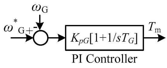 Several simulations were performed to examine the response of the proposed control framework in the PSCAD/EMTDC software environment. To show the effectiveness of using an IGBT rectifier, simulations were carried out for two different system topologies for the generator side converter: With a diode rectifier and with an IGBT rectifier. Similar parameters were used for both systems because the IGBT-based rectifier acts as a full-bridge diode rectifier under the gate-blocking condition owing to the diodes connected to the IGBTs in an anti-parallel configuration. For both cases, the load side converter was controlled by the VSG control method. The simulations were performed for the system shown in Figure 6. In the simulation study, the gas engine model was simplified by combining the engine time delay and the settling time of the speed controller. Therefore, a simple PI speed controller shown in Figure 7 represents the engine model. The parameters of the speed controller, the PMSG and the VSG control scheme are listed in Table 1 and Table 2, respectively. The circuit parameters and the PI control parameters are listed in Table 3.
