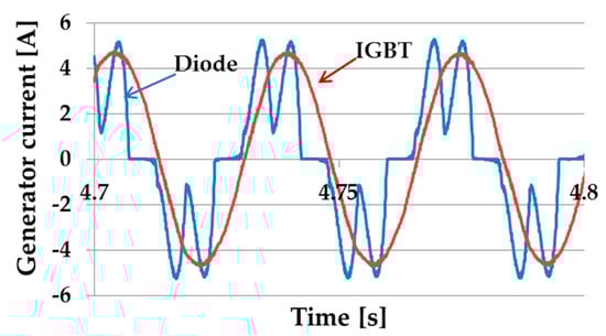 First, the simulation results of generator stator current waveforms in steady state are shown in Figure 8. As can be seen in Figure 8, the current waveform with the diode rectifier was not sinusoidal and contained large harmonic contents that could deteriorate the generator efficiency. The current waveform with the IGBT rectifier was very close to a sinusoidal waveform and the harmonic components were greatly reduced.