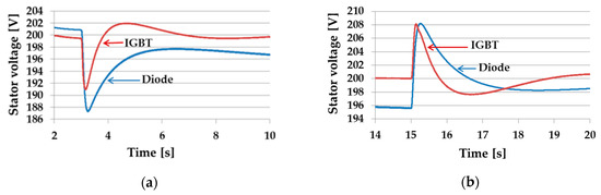 The generator stator voltage result for the loading case is shown in Figure 10a. With the diode rectifier, at the start of loading, the stator voltage decreased from its rated voltage of 200 V to 187 V, and then recovered to 196 V at steady state. With the IGBT rectifier, at the instant of loading, the stator voltage dropped to 191 V. After 2 s, the stator voltage caught its reference value of 200 V despite of a small overshoot. For the load removal case, as can be seen in Figure 10b, the stator voltage in the case of the IGBT rectifier reached its reference value after load transients. With the diode rectifier, the stator voltage had a small deviation from its rated value of 200 V under a steady state condition. Therefore, the waveforms in Figure 10 show the usefulness of stator voltage controller.