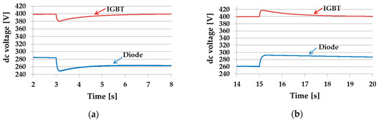 The dc link voltage responses to the loading case are shown in Figure 11a. With the diode rectifier, it could be seen that there was a considerable voltage drop of 40 V at the time of loading. Furthermore, the dc link voltage was maintained at around 260 V at the steady state. Since there was no control for both the generator field voltage and the dc link, the voltage could not reach to its no-load condition value of 290 V. With the IGBT rectifier, the amount of voltage drop at the start of load connection was about 20 V, and then the dc voltage reached its reference value after 3 s without any overshoot and steady-state error. Figure 11b depicts the dc-link voltage response to the load removal case. With the diode rectifier, the dc-link voltage recovered to its no-load condition value of 290 V for the case of removing the load from the system. With the IGBT rectifier, the dc link voltage rose from 400 V to 420 V when the load was removed from the system. After 2 s, it dropped to its reference value. For both the loading and the load removal cases, the results show the usefulness of dc link voltage controller. As the IGBT rectifier was a boost type converter, the dc link voltage with the IGBT rectifier was higher than that with the diode rectifier and could sufficiently provide the demanded load power.