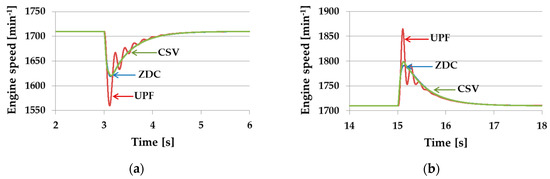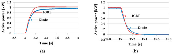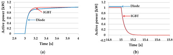 The engine speed response to the step loading case is shown in Figure 9a. With the diode rectifier, due to the applied load, the speed was decreased about 110 rpm. However, after 3 s, the speed returned to its reference value. With the IGBT rectifier, for the connecting of the load, the amount of speed decrease was 90 rpm, about 20 rpm smaller than the case of the diode rectifier. After 2 s, the speed returned to its reference value, properly. In Figure 9b, the engine speed response to the load removal case is shown and the engine speed variations in the case of diode rectifier were larger than the variations of the IGBT rectifier case. For both loading and load removal cases, the recovery time in the case of the diode rectifier to reach its steady state was also longer than that of the IGBT rectifier case.