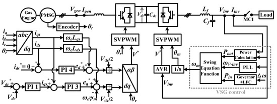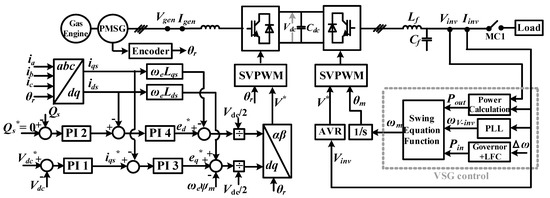 In this paper, a fully controllable frequency converter was employed in the PMSG based gas engine generator system which was operated in stand-alone mode as depicted in Figure 1. The whole system included an engine, a surface mounted PMSG, two IGBT-based back-to-back power converters with a dc link, and a load. This study was performed with three main objectives. The first one was to improve the generator output stator current waveform by using an active rectifier instead of a diode rectifier. The second was to support a smooth power transition during load changes by applying the VSG control on the load side converter. The third objective was to evaluate the performance of the proposed system by using different control strategies on the PMSG side converter. In order to achieve the mentioned objectives, the system responses were studied under loading and load removal cases in a PSCAD software environment. The rest of the paper is organized as follows: The VSG control scheme for the control of load side converter is explained in Section 2. The mathematical model of a PMSG and the CSV control method are presented in Section 3. The simulation results of the system with a diode rectifier and with the proposed active rectifier are discussed in Section 4. The simulations of the proposed PMSG system with different control strategies are performed in Section 5. Finally, this paper is concluded in Section 6.