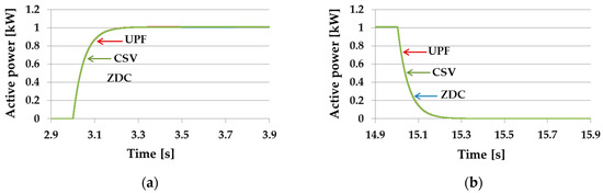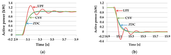 Results of the inverter output active power (a) loading case, (b) load removal case.