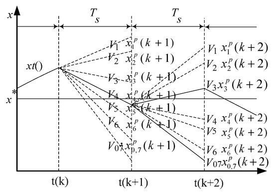 Within one sampling interval, the cost function values that correspond to the seven voltage vectors are calculated by the FCS. The switching state that minimizes the cost function is chosen as the switching state of the inverter. The process of model prediction optimization is shown in Figure 2, where , , and are the torque of the real response, the predicted value, and the reference value, respectively. If the corresponding x(k) is the best value at time k, the cost function value x(k + 1) corresponding to the seven voltage vectors is calculated at time (k + 1), and the seven calculated cost functions values are compared with reference values, where the closest is to be the optimal solution at the moment (k + 1). V4 is the control signal of the voltage vector corresponding to the optimal value of the time (k + 1). In the same way, V3 should be selected as the optimal control signal at time (k + 2) [12].