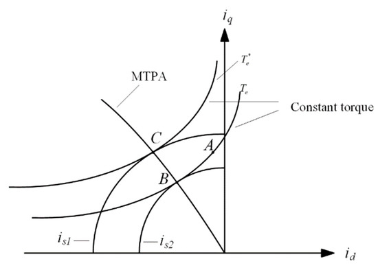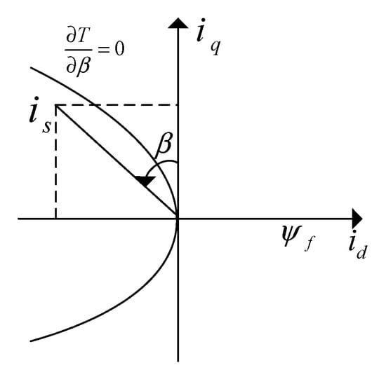 In order to optimize the operation of the PMSM, the condition must be fulfilled to ensure and its current operating point is on the MTPA curve. In addition, the condition indicates that the PMSM is operating at the optimum state.