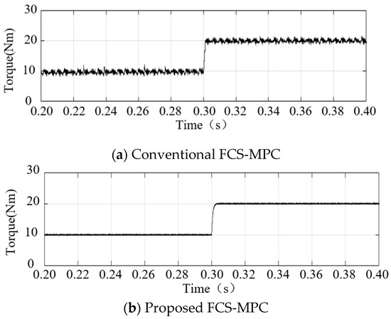 In order to compare the torque dynamic, a magnified view of the torque response is shown in Figure 7. From Figure 7, we can see that the torque suddenly increases from 10 to 20 N⋅m in only 0.003 s, and in the process of torque mutation, the conventional FCS-MPC method has obvious overshoot. Compared with the conventional FCS-MPC, the improved method has faster dynamic response because the motor adopts optimized duty cycle modulation in the whole control cycle.