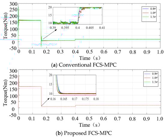 As we all know, a temperature rise of the motor will cause the stator internal resistance to increase. The influence of internal resistance on the torque is discussed in this paper. The torque waveforms of the two control methods in the condition of rated stator resistance (the blue solid line) and 1.5-times the rated value (the red dashed line) are given in Figure 8a,b, respectively. It is noticeable that slight torque ripples occur under the conventional FCS-MPC method when the resistance increases, while the proposed FCS-MPC control has better robustness in which the torque is insensitive to the resistance change. However, when entering a steady state, the two control systems are not affected by internal resistance changes.