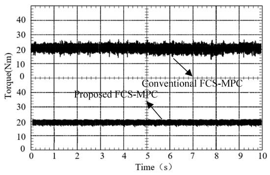 Figure 6 shows the simulation results of traditional FCS-MPC and improved FCS-MPC under steady-state conditions. The reference value of motor speed is set to 500 rpm, and the load torque is 20 N⋅m. As can be seen from the figure, compared with conventional FCS-MPC, the torque ripple of the improved method is significantly reduced. In Figure 6, the average values of the torque ripples of proposed (0.9 N⋅m) are smaller compared to those of conventional FCS-MPC (3 N⋅m) under the same conditions. It is noted that, in this paper, torque ripples are calculated by the following equation [22]: