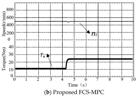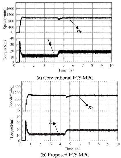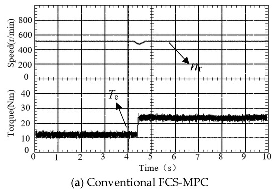 In order to test the dynamic performance of the proposed FCS-MPC method, a load torque of 25 N⋅m was suddenly added when the steady speed of the motor was 500 rpm. Figure 12 shows that the response times of proposed FCS-MPC and conventional FCS-MPC are approximately the same; however, the proposed FCS-MPC strategy torque ripple is smaller than that of the conventional FCS-MPC. Meanwhile, the proposed FCS-MPC method enables the motor to quickly recover to the reference speed value compared to conventional FCS-MPC.