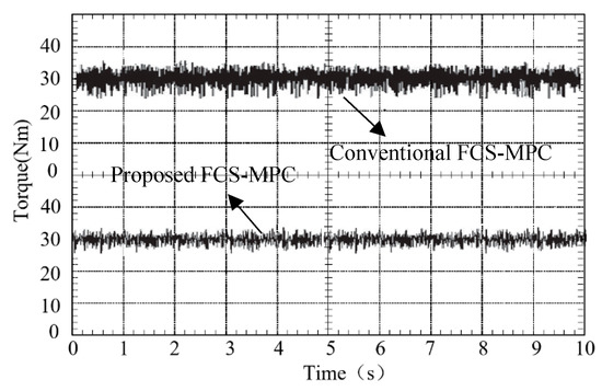 Figure 13 shows electromagnetic torque waveforms of two methods, with the load torque reference value set to 30 N⋅m. As can be seen from Figure 13, the method of proposed FCS-MPC can significantly reduce torque ripple by comparing torque waveforms; the average torque ripple of proposed method is only 3 N⋅m while that of conventional FCS-MPC is 7 N⋅m.