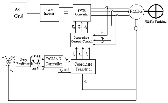 The schematic of a PMSG-based Wells turbine system is shown in Figure 1. The PMSG is driven by the Wells turbine to deliver maximum power to the AC grid. A designed AC/DC converter then converts the AC power generated by the PMSG into an adjustable DC power. An effective method of DC link voltage control based on a Grey–RCMAC control system is proposed for wave period variations of the turbine or load changes, controlling the electromagnetic torque of a PMSG driven using the variable speed Wells turbine; the effects of different speed variation forms are considered.