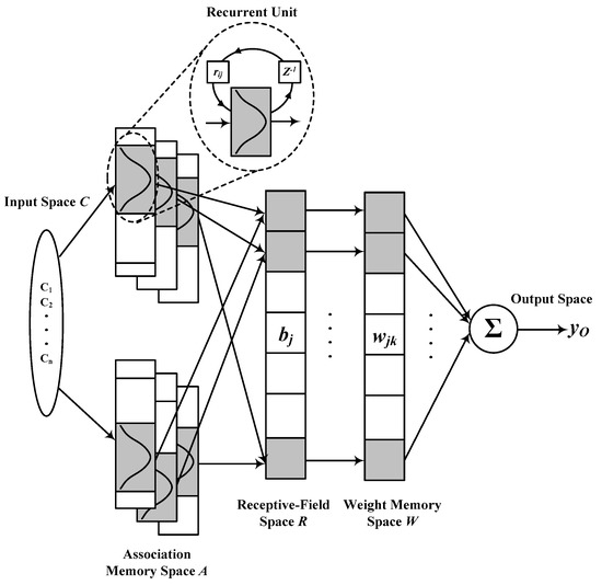 Figure 2 shows a proposed RCMAC, where z−1 denotes a time delay. This RCMAC comprises input, association memory, receptive field, weight memory, and output spaces. Signal propagation for each layer is introduced as follows: