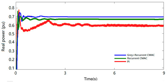 The time domain simulation of a wave energy system was run with constant load under sufficient ocean waves. WECS output power is shown in Figure 3, which demonstrates that Grey–RCMAC has a smaller transient response, smaller oscillation, and best control response in comparison with the traditional PI controller. The transient response at the beginning clearly shows that the PI controller fluctuates more, whereas the Grey–RCMAC oscillates only slightly. The Grey–RCMAC, RCMAC, and PI controller average powers are 0.7, 0.675, and 0.597 pu, respectively. It can be seen in Figure 3 that the proposed Grey–RCMAC improves by 14.7% more than the PI controller. Table 1 lists the numerical comparison results of more control methods and shows the robustness of the Grey–RCMAC control.