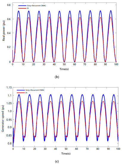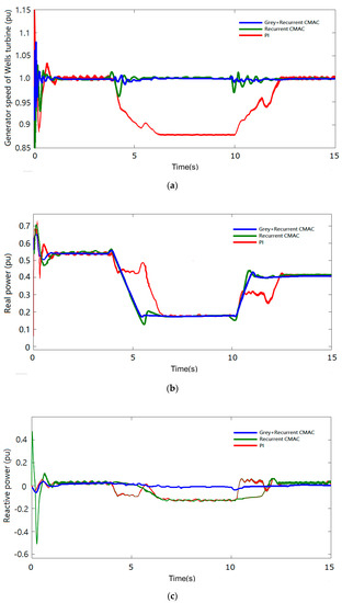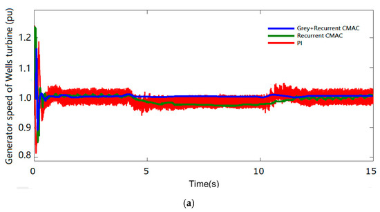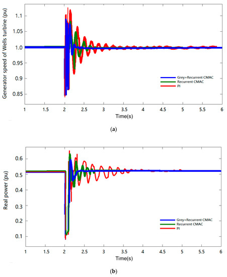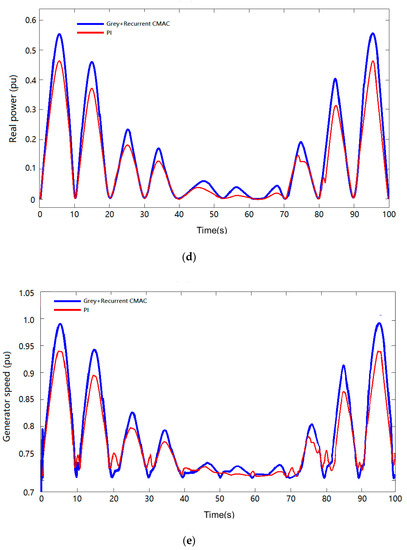 On the other hand, the random characteristics of practical ocean waves produce an oscillation in the pressure drop [7,8]. To investigate the robustness and usefulness of the Grey–RCMAC control scheme, two cases studied are conducted. Figure 5a shows the pressure variation of the studied system. Figure 5b,c illustrate the performance of two controllers for real power and generator speed of the PMSG, respectively, and they randomly change between 0 and 0.7 pu as well as between 0.8 and 1.12 pu. Figure 5d,e plot the dynamic responses of the real power and the generator speed of the PMSG, respectively, and they randomly vary between 0 and 0.6 pu as well as between 0.7 and 1.0 pu. Table 2 summarizes the numerical comparison results of the PI, RFNN, CMAC, RCMAC, and Grey–RCMAC with IPSO controller for Wells turbine speed changes.