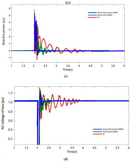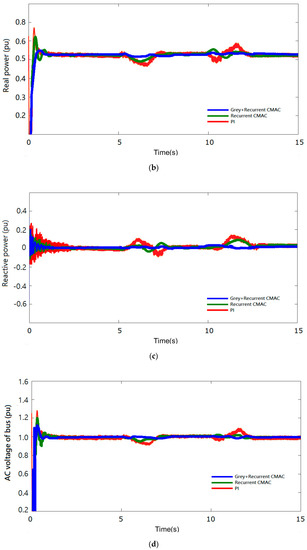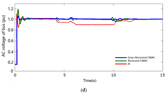 The Wells turbine rotational speed changes from 15.5 to 4.5 and 4.5 to 12 m/s at 4 and 11 s, respectively. The Wells turbine’s rotor speed response is shown in Figure 4a. The RCMAC-based PMSG’s WECS rotor speed’s return to the steady state response is the fastest, demonstrating that the Grey–RCMAC with IPSO implements better than the RCMAC and PI controllers from the viewpoint of speed perturbation resistance. Figure 4b,c show the performance of three controllers for real and reactive power under the variation of wave speed change, respectively, and illustrate real power variations of the PMSG. The Grey–RCMAC with IPSO control scheme has fast tracking response speed and more stable and better power flow control effect. The disturbance of Grey–RCMAC is smaller than that of RCMAC and PI controllers in power variation. The AC bus voltage of PMSG on the grid side is shown in Figure 4d. When the WECS rotor speed changes, this method can minimize the change in voltage output amplitude and recover to 1.0 pu as soon as possible. On the contrary, Figure 4d shows that among the three methods, the amplitude of the PI controller varies the most when t = 4 and 10 s, the RCMAC amplitude changes the least, followed by recurrent CMAC.