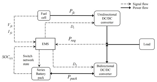 The rest of the paper is organized as follows. Section 2 includes three parts: Part 2.1 describes the modeling of the proton exchange membrane fuel cell. Part 2.2 describes the methods and results of the battery test, and the modeling of series lithium battery pack is described. Part 2.3 describes the modeling of the DC/DC converter. Section 3 includes two parts: Part 3.1 first introduces the circuit structure of the switch network, and then describes the specific rules of the EEMS. Part 3.2 describes the algorithm of the ECMS. Section 4 gives the simulation results and analysis. The conclusion is drawn in Section 5.