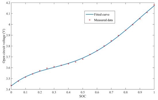 The open circuit voltage test is based on No.1 battery. Figure 4 shows the comparison between the measured data and fitted curve.