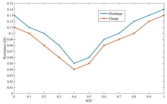 HPPC test is intended to determine dynamic power capacity, resistance over the battery’s useable voltage range using a test profile that incorporates both discharge and regen pulses. The test profile can be seen in Ref. [45] of Jeffrey. The charge and discharge resistance of the lithium battery was measured by HPPC test. The resistance of No.1 battery is shown in Figure 5: