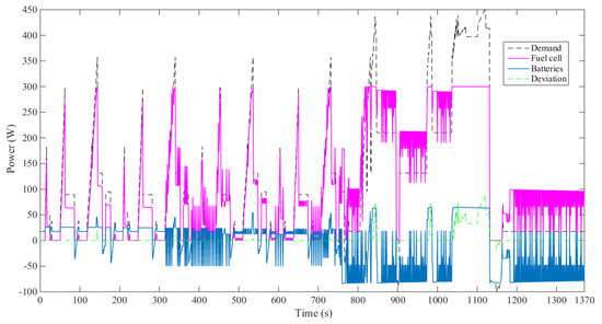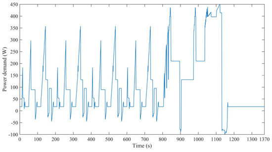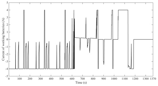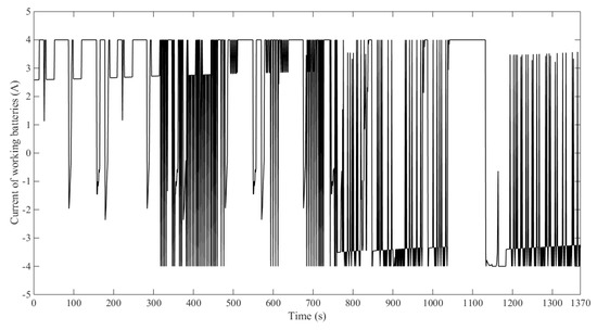 In Table 4, is the current load power demand. The fuel cell maximum power and minimum power are 300 W and 0 W respectively, which is a 25 times reduction in fuel cell simulation results. is the No.1 battery maximum reference power when the SOC of No.1 battery is equal to the SOC at equilibrium point in ECMS mode. Briefly speaking, in this paper, is the power when the SOC of No.1 battery is 0.6 and the discharge current is 4 A. is the charging or discharging power of each battery when the charging or discharging current is . is the number of batteries in the subscript state, and are higher than and lower than respectively, , and are the maximum, minimum and average value of SOC respectively. For example, is the number of batteries whose SOC is higher than the .