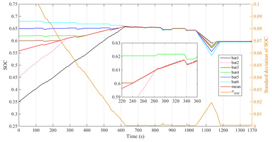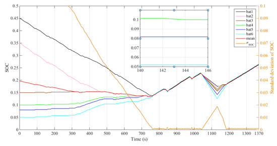 When the standard deviation is less than the threshold, it represents the end of the equalization process. The consistency of lithium battery pack is good, which can be regarded as the SOC of each battery is equal. However, EEMS can only make SOC tend to be consistent while the demand power is satisfied and cannot control the SOC value at the end of equilibrium. Therefore, it is necessary to combine other EMS to make SOC tend to target value, and through this kind of combination, fuel economy and system durability can be considered.