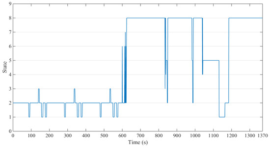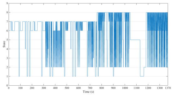 For state 2: Power demand is higher than the minimum power and lower than the maximum power of the fuel cell. Since the high SOC batteries are the majority, in order to achieve the goal of rapid equalization, the fuel cell needs to charge the low SOC batteries while meeting the power demand. The switch network control strategy is: disconnect the batteries whose SOC are higher than , and charge other batteries.