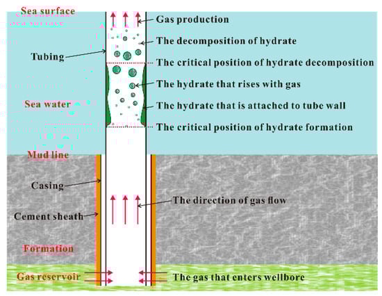 With the rapid development of the global economy, the discrepancy between oil and gas supply and demand has become more prominent in most countries. The shortage of oil and gas has become one of the main bottlenecks restricting economic and social development [1,2,3]. Our location to explore energy resources has changed from the land to the ocean, and offshore oil and gas will become important energy resources in the future [4,5,6]. The exploration and utilization of offshore oil and gas resources have attracted more attention in recent years. In offshore gas reservoir production, when water-bearing gas is produced, wellbore temperature and pressure will change continuously. Affected by the low-temperature environment of seawater, gas hydrate is easily formed in wellbores, and then pipelines might be blocked, resulting in safety accidents. Therefore, it is urgent to carry out relevant research on hydrate formation and decomposition regularities in pipelines during the production of offshore gas reservoirs.