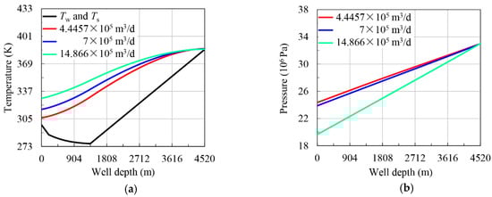 The basic parameters of well A-X are as follows [49]: it is a vertical well, well depth is 4520 m, seawater depth is 1350 m, sea surface temperature is 298 K, geothermal gradient is 0.0345 K/m, and bottom hole pressure is 32.97 × 106 Pa. Based on the basic data of well A-X, the wellbore temperature and pressure are calculated under the condition of different daily gas production (Figure 3), and the results are compared with the field measured data in Table 1. The calculation of relative error is as follows: