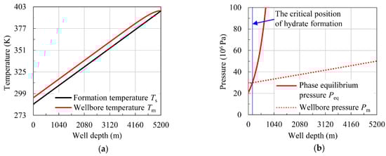 Calculated data of well LN-X: (a) wellbore temperature and formation temperature; (b) wellbore pressure, hydrate phase equilibrium pressure, and hydrate formation region.