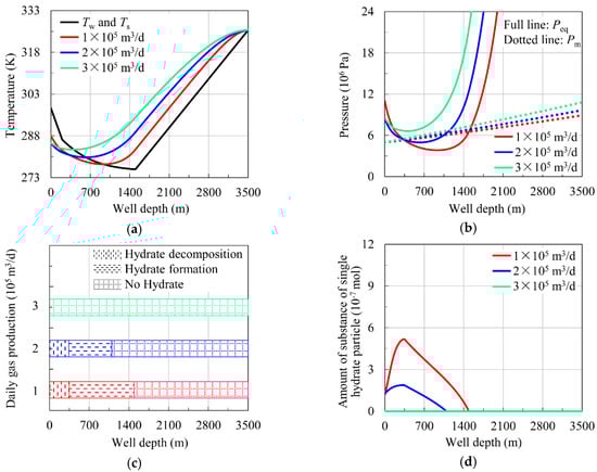 From Figure 5c, it can be seen that when the daily gas production is 1 × 105 m3/d, the hydrate formation region is from 1492 m to 348 m and the hydrate decomposition region is from 348 m to 0 m. When the daily gas production is 2 × 105 m3/d, the hydrate formation region is from 1097 m to 341 m and the hydrate decomposition region is from 341 m to 0 m. When the daily gas production is 3 × 105 m3/d, no hydrate is formed in the wellbore.