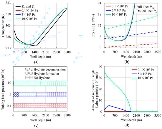 From Figure 6c,d, it can be seen that when other conditions are constant, with increased tubing head pressure (from 0.1 × 106 to 10 × 106 Pa), the hydrate formation region in the wellbore and the amount of substance of single hydrate particle increase, which makes it easier to block the wellbore and even harder to keep the safety of production.