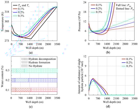 From Figure 7c, it can be seen that when the water content is 0.1%, the depth of hydrate formation is from 1492 m to 348 m and the region of hydrate decomposition is from 348 m to 0 m. When the water content is 0.2%, the hydrate formation region is from 1314 m to 298 m and the hydrate decomposition region is from 298 m to 0 m. When the water content is 0.3%, the hydrate formation region is from 997 m to 380 m and the hydrate decomposition region is from 380 m to 0 m.
