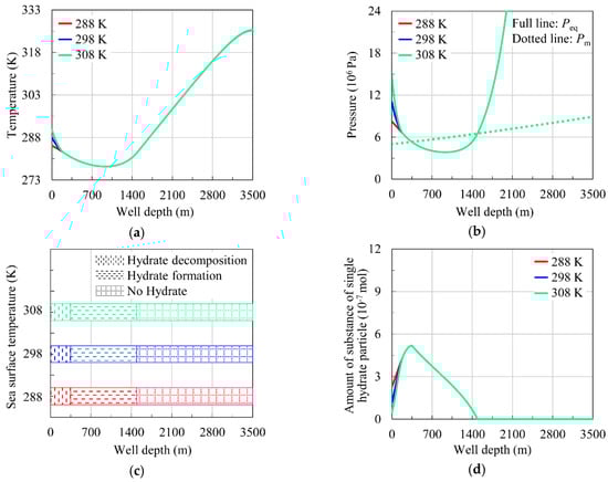 Wellbore pressure Pm does not change with increased sea surface temperature (from 288 K to 308 K), as shown in Figure 8b. The hydrate formation region is constant, from 1492 m to 348 m (Figure 8c), the hydrate formation rate is equal, and the amount substance of single hydrate particle remains constant (Figure 8d). The hydrate decomposition region does not change from 348 m to 0 m (Figure 8c), and hydrate decomposition rate increases with sea surface temperature (Figure 8d).